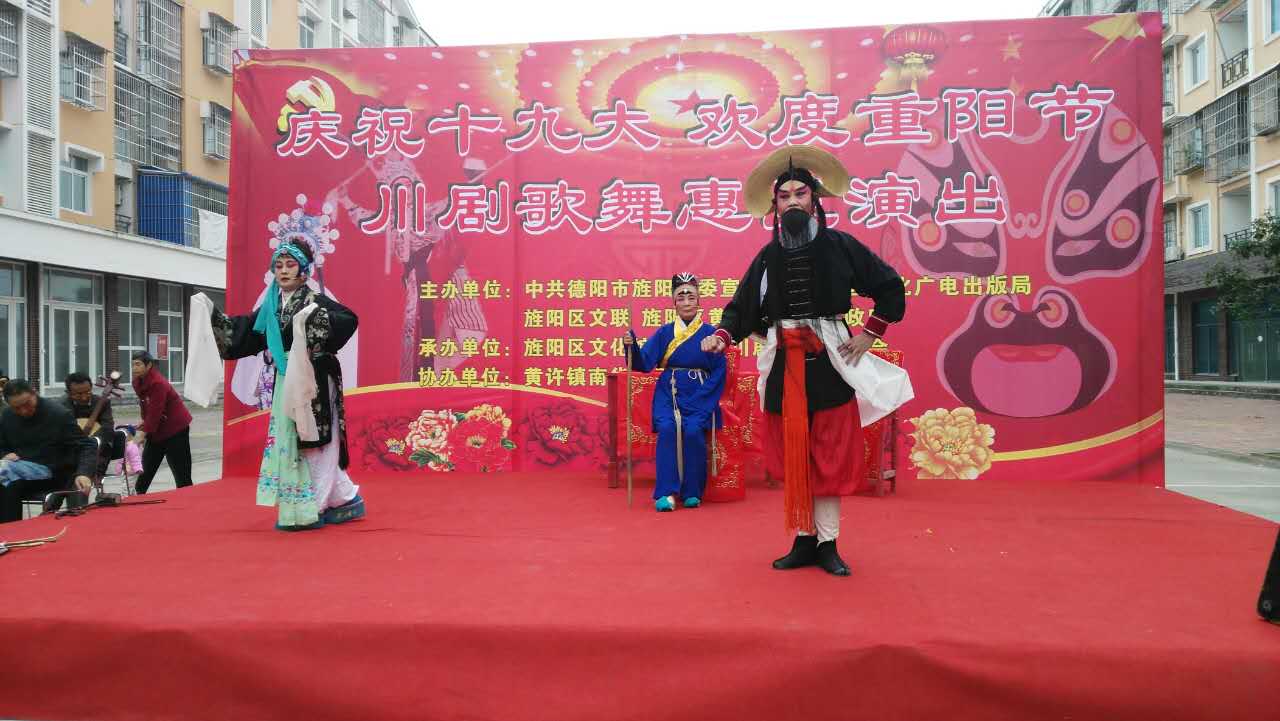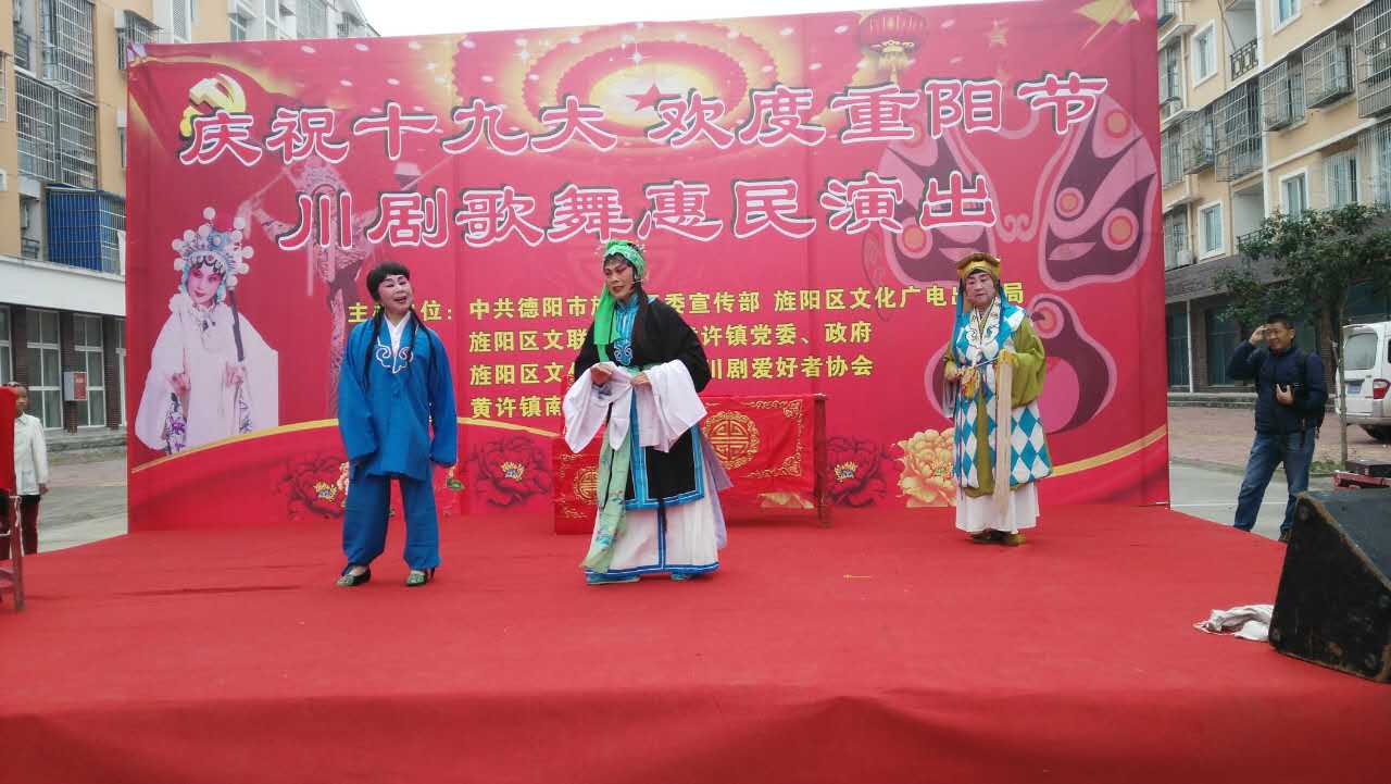 为庆祝党的十九大胜利召开,贯彻落实文化惠民政策,在重阳节来临之际,由区委宣传部、区文广出版局、区文联、黄许镇党委政府主办,区文化馆、区川剧爱好者协会承办的“庆祝十九大 欢度重阳节”川剧歌舞惠民演出在黄许镇文化院坝举行。
