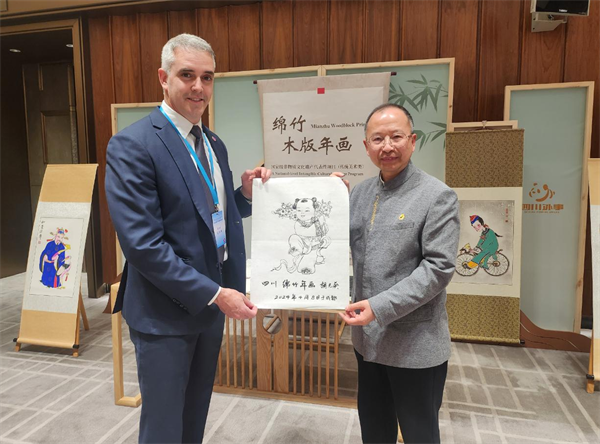 4月8日,2024驻华使节代表团参访四川活动在成都举行。绵竹木版年画多件代表性作品在现场精彩呈现,多维度展示了非遗文化的深厚底蕴,让各国驻华使节和国际组织代表深深感受到了中华优秀传统文化的魅力。