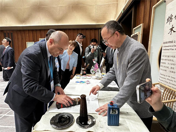 活动现场,绵竹市民间文艺家协会名誉主席、省级非物质文化遗产传承人胡光葵现场演示年画印版、彩绘的制作过程。参加本次活动的外国驻华使节代表团成员亲自动手体验,现场氛围热烈。