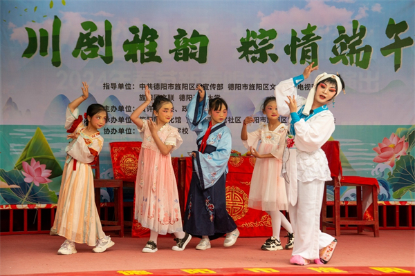 活动组织当地青少年、中老年群体共同参与,将传统节日端午节和川剧传统艺术巧妙结合,穿插了川剧表演、川剧化妆和青少年基础动作训练、包粽子、群体文娱等丰富多彩的活动环节,为当地群众呈现了一场精彩的端午大餐。