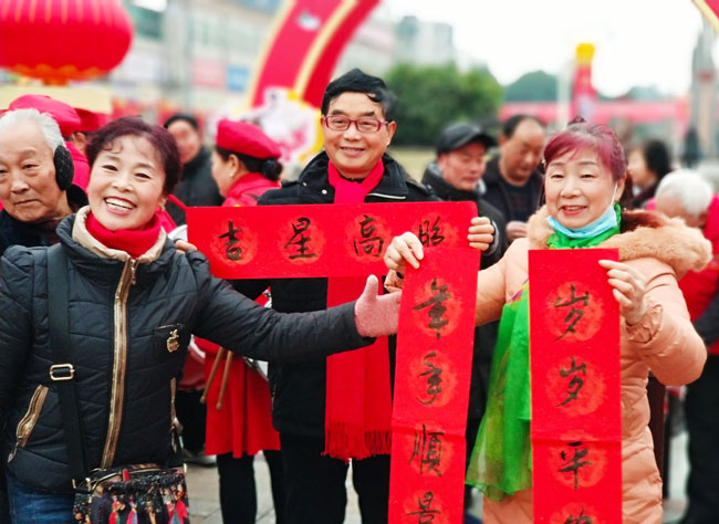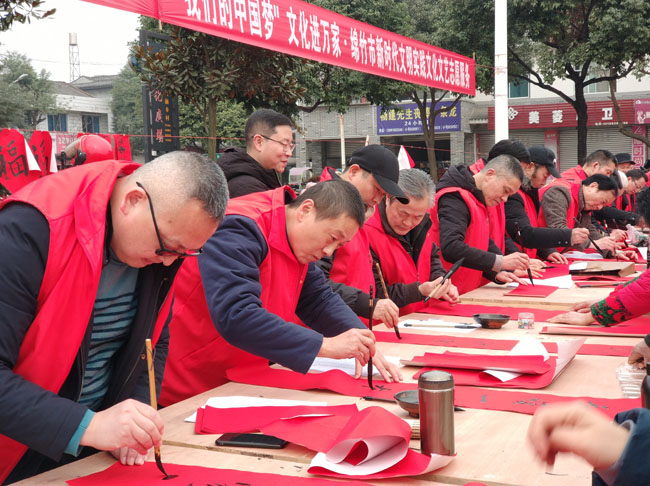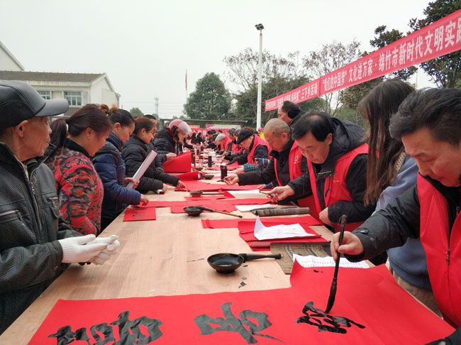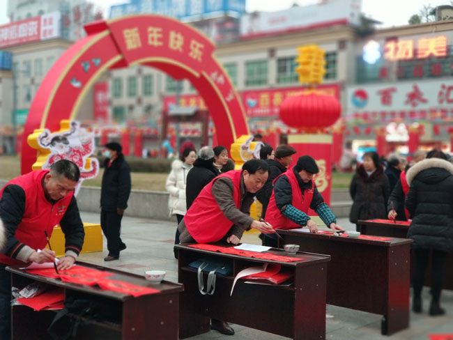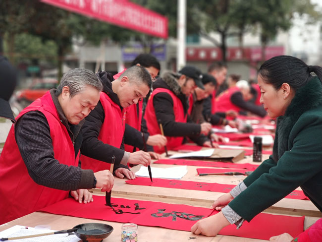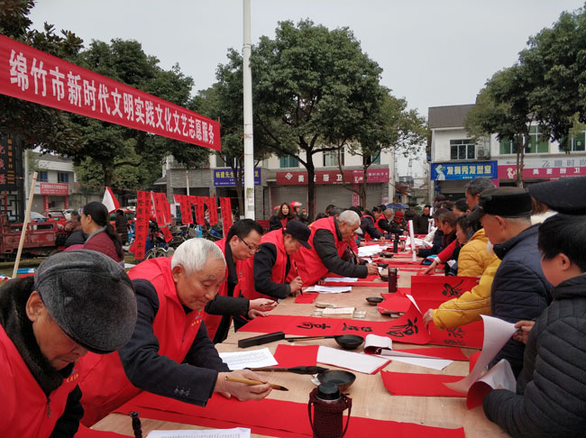 从1月10日至17日,30余名志愿者先后前往遵道镇、齐天镇、绵远镇、拱星镇、板桥镇、绵竹中心广场、孝德年俗村,免费为当地群众送门神、写对联、送“福”字,每天书写对联5000余副,7天共计3万余副,让群众感受到浓浓的节日气息,欢欢喜喜迎接新春佳节。
