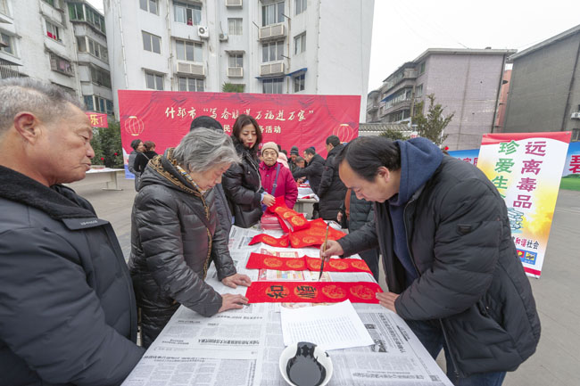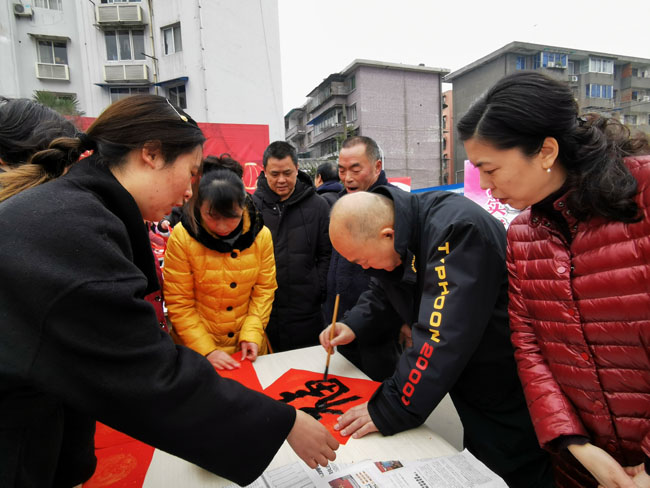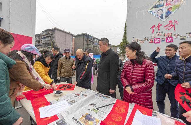 中国书协理事、中国国家画院研究员、四川省政协书画院常务副院长、四川省书协副主席洪厚甜带队,什邡市书协会员20余名会员为市民义务书写了近500副春联和“福”字。