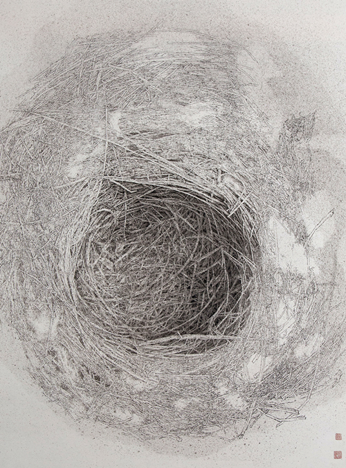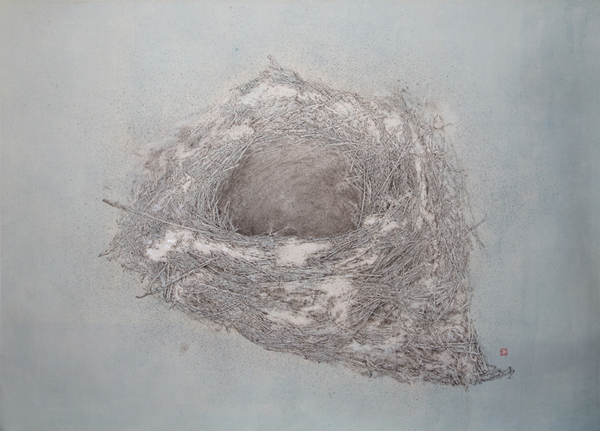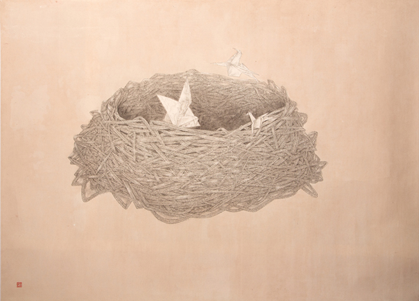 作品《化境》,从画面上看是一个孕育生命的“巢”以及三只纸鹤,代表回归、温暖、安定与和谐,但它更像一个摇篮,寄托着人类对未来的希望。